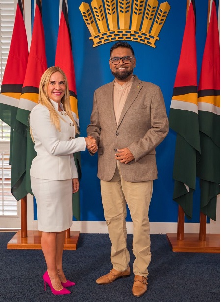 Idalia Cabrera Pimentel, directora general de EH+ y el presidente guyanés Irfaan Ali
