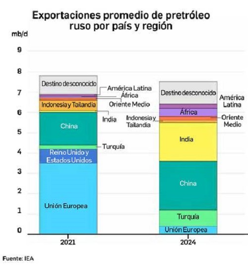 Los datos más recientes indican que China, en la última semana de agosto pasado, recibió un millón 280 mil barriles diarios y, en julio anterior, India compró un millón 780 mil barriles diarios. El año pasado, de acuerdo con las estadísticas que maneja la Organización de Naciones Unidas, China importó petróleo ruso por 62 mil 600 millones de dólares, en tanto India lo hizo por 53 mil millones de dólares.